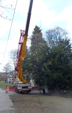 ![]() Douglas Fir tree to be removed | ![]() The crane | ![]() First pick 1.5 tonnes (climbers view) |